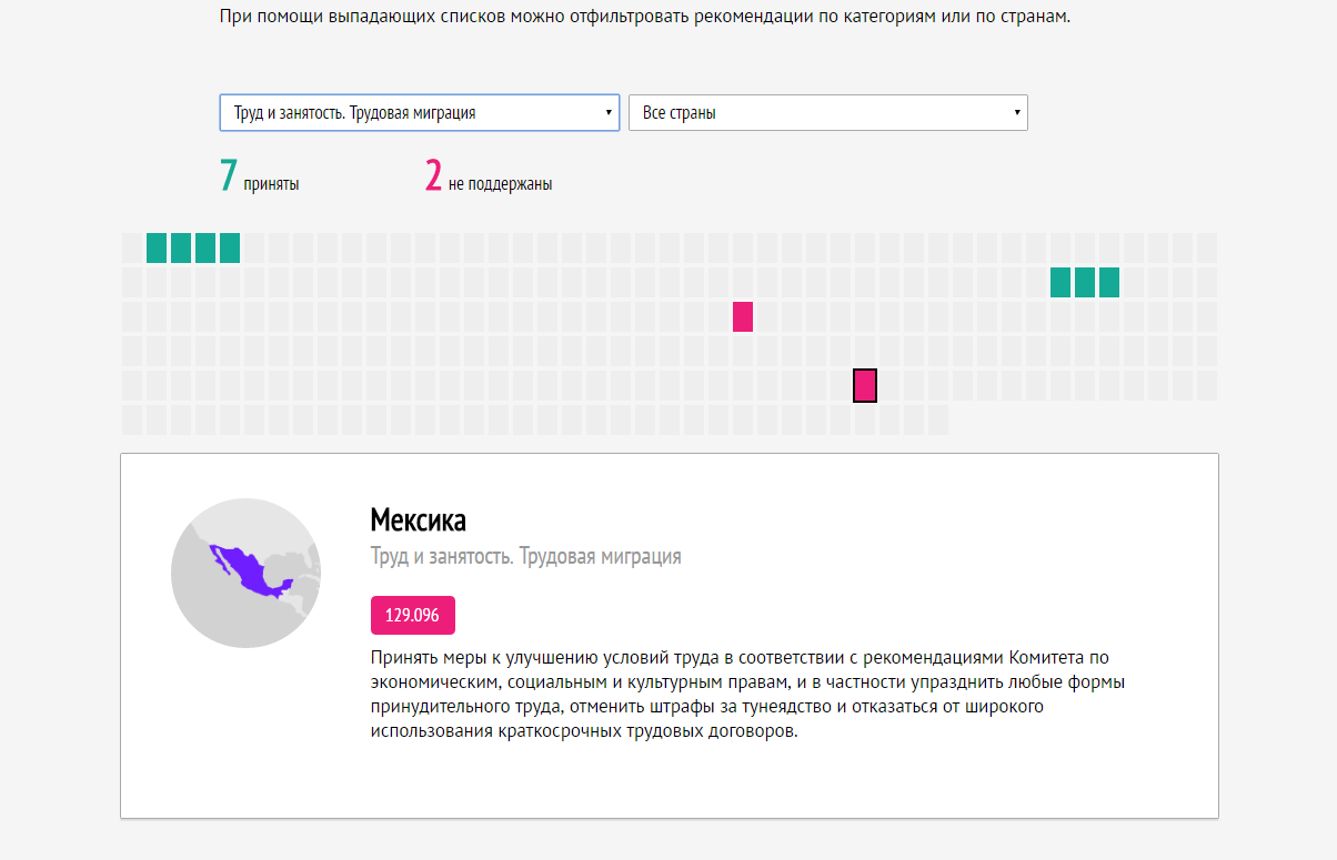 Сярод іх, напрыклад: «разгледзець пытанне аб стварэнні нацыянальнай праваабарончай ўстановы» ад Зімбабвэ, "аказваць падтрымку інстытуту традыцыйнай сям'і» ад Расіі і «працягваць удасканальваць цудоўную сістэму сацыяльнай абароны» ад Венесуэлы.