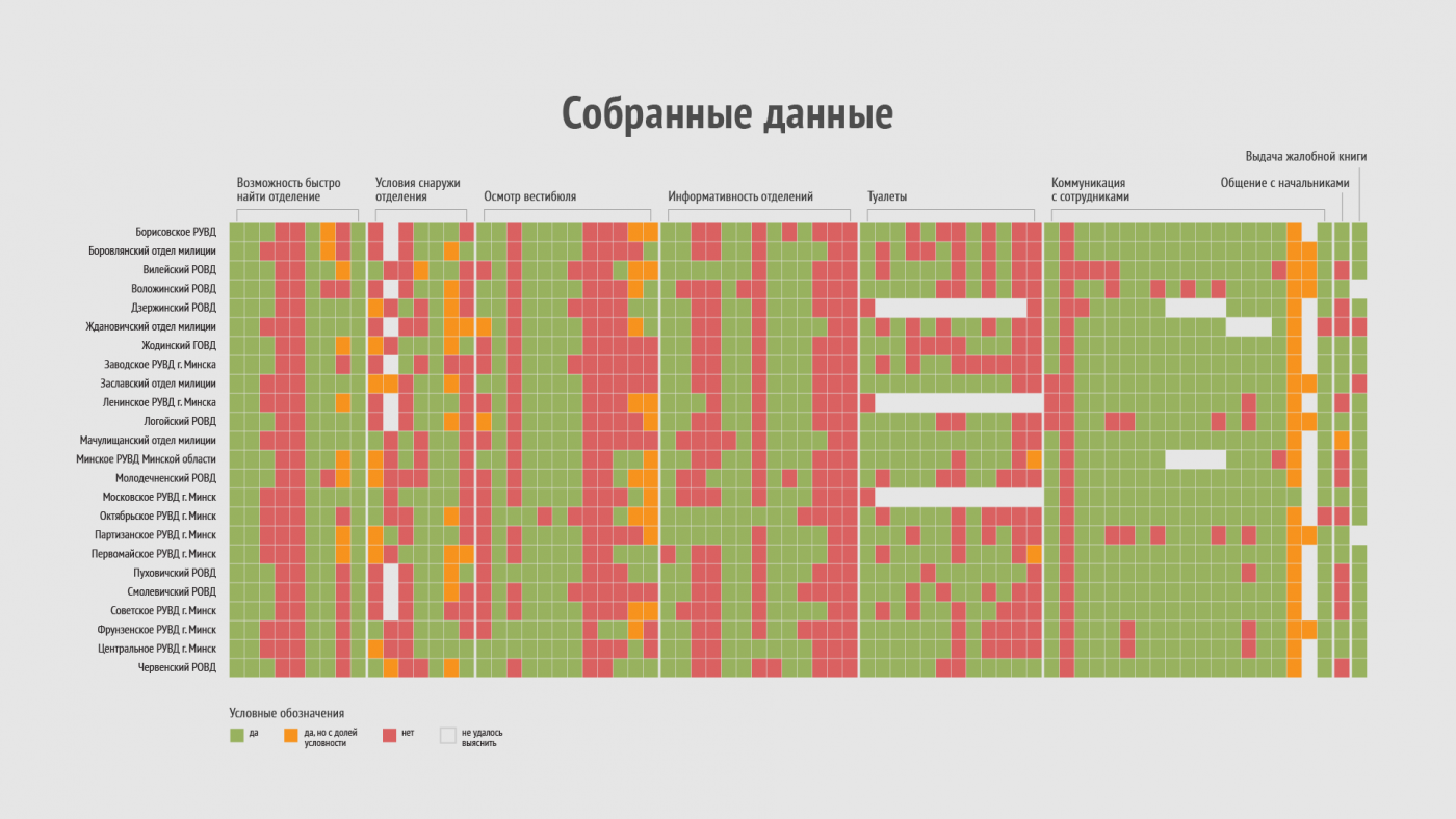 Валанцёры вывучалі сайты міліцэйскай сістэмы, вялі візуальнае назіранне ў аддзяленнях міліцыі, а таксама наведвалі начальнікаў аддзяленняў у іх прыёмныя гадзіны.